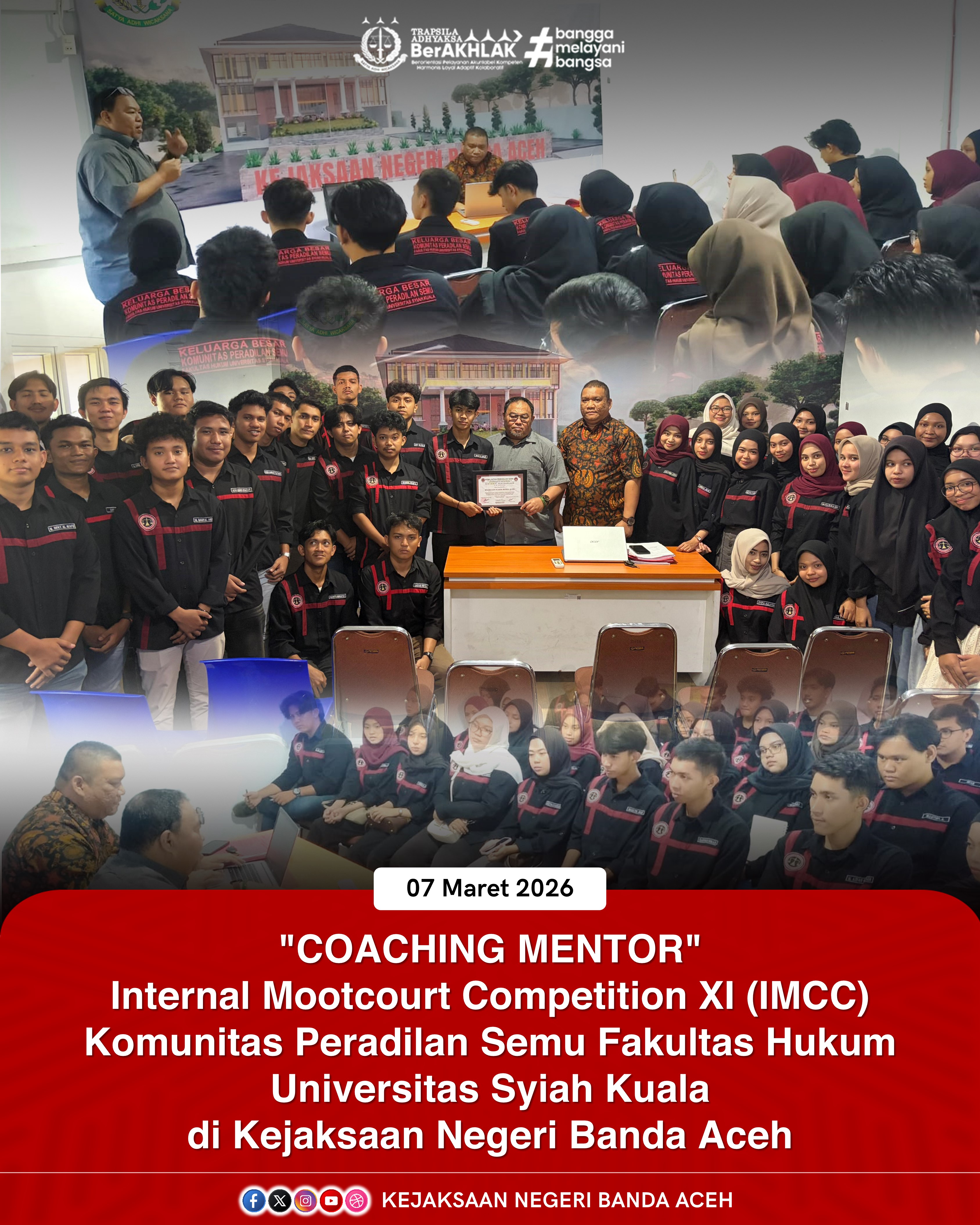 Kejaksaan Negeri Banda Aceh menyelenggarakan kegiatan Internal Moot Court Competition (IMCC) XI yang diikuti oleh Komunitas Peradilan Semu Fakultas Hukum Universitas Syiah Kuala. Kegiatan tersebut mengusung tema “Mewujudkan Masyarakat Anti Narkoba sebagai Bekal Masa Depan melalui Upaya Preventif maupun Represif dengan Menggunakan Instrumen Penegak Hukum Negara sebagai Pilar Utama” dan dilaksanakan di Aula Kejaksaan Negeri Banda Aceh pada pukul 10.00 WIB s.d. selesai.
