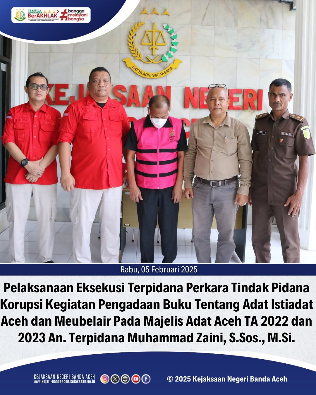 Pada hari Rabu, 05 Februari 2025, Kepala Seksi Tindak Pidana Khusus, Putra Masduri, S.H., M.H., melaksanakan eksekusi terpidana Perkara Tindak Pidana Korupsi Kegiatan Pengadaan Buku Tentang Adat Istiadat Aceh dan Meubelair Pada Majelis Adat Aceh TA 2022 dan 2023 An. Terpidana Muhammad Zaini, S.Sos., M.Si. berdasarkan Putusan Mahkamah Agung Nomor 255 K/Pid.Sus/2025 tanggal 21 Januari 2025, dengan pidana yang dijatuhkan kepada Terdakwa yaitu pidana penjara selama 3 (tiga) tahun dan pidana denda sebesar Rp200.000.000,00 (dua ratus juta rupiah)