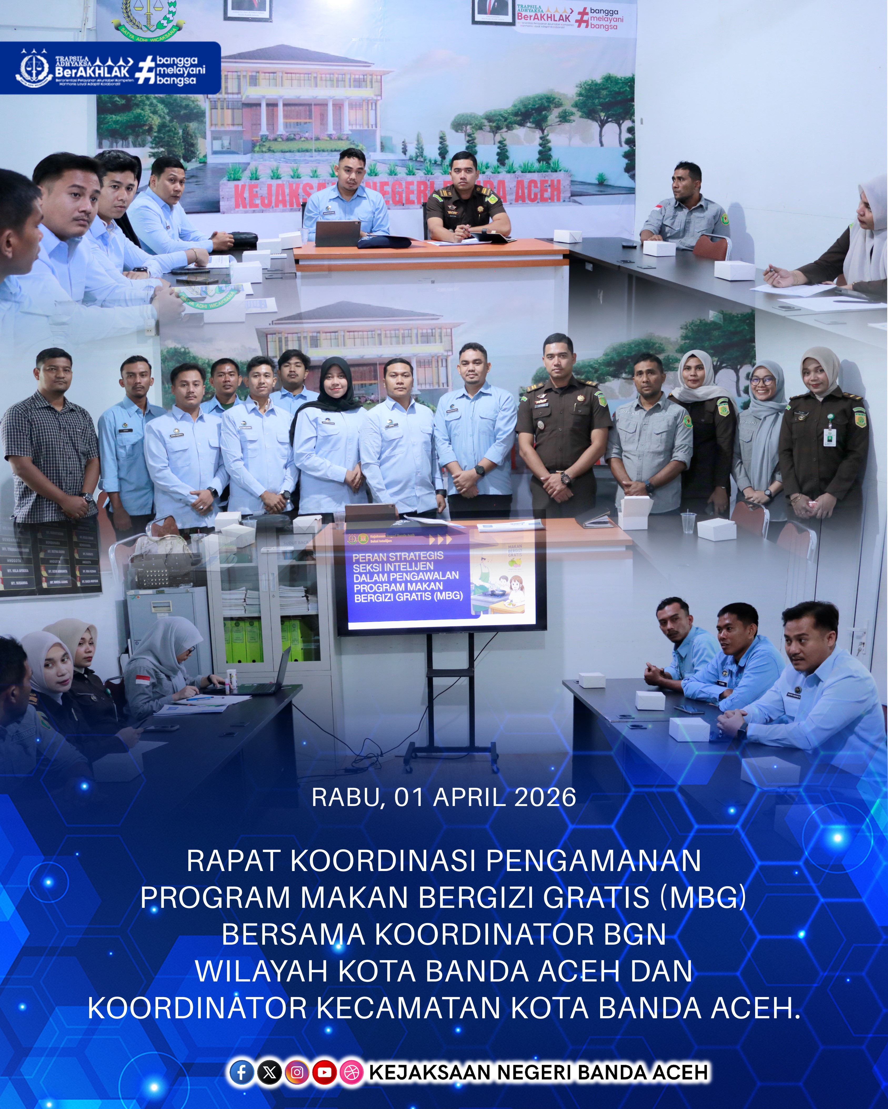 Rapat ini merupakan wujud sinergi yang kuat antara Kejaksaan Negeri Banda Aceh dengan Koordinator BGN wilayah Kota Banda Aceh dan para Koordinator Kecamatan di Kota Banda Aceh. Dalam hal ini, Koordinator BGN wilayah Kota Banda Aceh, Muhammad Reza, bersama tim memaparkan data update pelaksanaan MBG, data penerima manfaat, kondisi 36 SPPG, serta berbagai isu di lapangan. Kejaksaan melalui Seksi Intelijen melaksanakan tugas Pengamanan Pembangunan Strategis (PPS) berdasarkan Pedoman Jaksa Agung RI Nomor 5 Tahun 2023 dan berbagai Surat Perintah yang diterbitkan.
